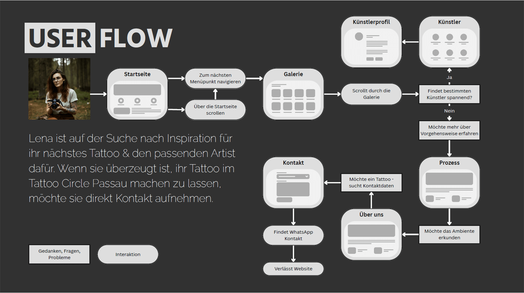 Zuerst habe ich mir die bestehende Website genau angesehen: Was ist da? Was fehlt? Um wirklich nutzerzentriert zu arbeiten, habe ich zwei Personas entwickelt: „Lena“ (24, sucht Inspiration für ihr erstes Tattoo) & „Thomas“ (48, Sammler, schätzt Qualität & Fakten). So konnte ich sicherstellen, dass ich sowohl emotionale als auch rationale Bedürfnisse im Blick habe.